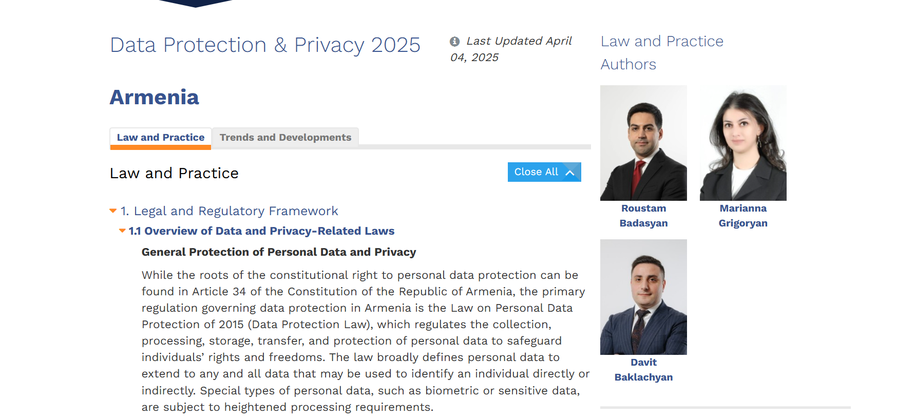 We are pleased to announce, that Badasyan Consulting has contributed the Armenia chapter to the recently published Chambers and Partners Data Protection & Privacy 2025 Global Practice Guide.